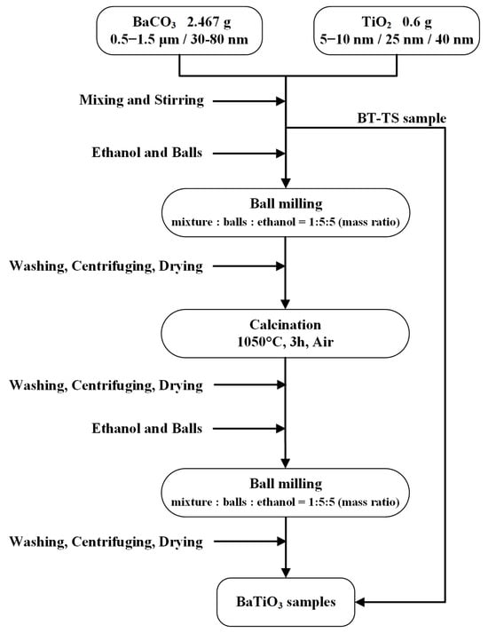 This solid-state synthesis method for BaTiO3 involves the use of two primary raw materials, titanium dioxide (TiO2) and barium carbonate (BaCO3). This study incorporated three different particle sizes of an anatase-type TiO2 (5–10 nm, 25 nm, and 40 nm) and two variations of BaCO3 (micrometer-scale and 30–80 nm scale). The raw materials were mixed in a stoichiometric molar ratio of Ba to Ti elements (Ba: Ti = 1:1), and for the preparation of the composite, 0.6 g of TiO2 and 2.467 g of BaCO3 were blended in a laboratory beaker. Figure 1 illustrates the detailed synthetic and fabrication process of BaTiO3 employed in this research.