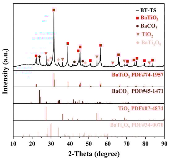 Figure 2 displays the X-ray diffraction pattern of the BaTiO3 sample (BT-TS), synthesized via the traditional solid-state synthesis method, which involved calcining a mixture of micrometer-scale BaCO3 and TiO2 precursors at 1050 °C and 3 h under an air atmosphere. In Figure 2, the main diffraction peaks aligned with the tetragonal P4mm space group characteristic of BaTiO3 (JCPDS 74-1957), confirming that BaTiO3 has been synthesized. However, upon the comparative analysis with the standard PDF card, impurities were identified, including BaTi4O9 (JCPDS 34-0070), unreacted TiO2 (JCPDS 07-4874), and BaCO3 (JCPDS 45-1471) raw materials.