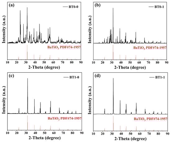 On the other hand, the impact of the introduction of ball milling on the tetragonality of the synthesized BaTiO3 is also very much worth noting. Therefore, based on the analysis and calculation of the crystal structures of the four samples in the software JADE 9.0, different tetragonalities c/a were obtained, as shown in Table 1. From Table 1, it can be seen that the tetragonality of the samples is all around 1.01 except BT0-1, which on one hand indicates that the tetragonality of BaTiO3 synthesized by the solid-state method is indeed good. The tetragonality is affected due to the fact that BT0-0 and BT0-1 did not produce pure BaTiO3. On the other hand, by comparing the tetragonality of BT1-0 and BT1-1, it can be seen that ball milling of the BaTiO3 has no negative impact on the tetragonality.