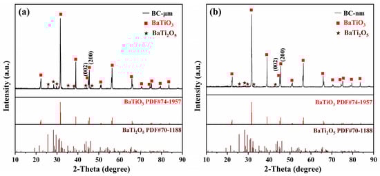 Figure 5 presents the XRD pattern of BC-μm and BC-nm. For both BC-μm and BC-nm samples, the XRD results indicate that the main diffraction peaks correspond to the characteristics of the tetragonal P4mm space group of BaTiO3 (JCPDS 74-1957), once again confirming the successful synthesis of BaTiO3. Compared to the BT-TS sample in Figure 2, the absence of peaks for unreacted TiO2 and BaCO3 is very evident, indicating that the ball milling process can effectively promote a comprehensive reaction of the raw materials, thereby significantly reducing the presence of unreacted raw materials. Moreover, the peaks for BaTi4O9 have also completely disappeared, further demonstrating the significant effect of the ball milling process in improving reaction efficiency and reducing impurities.