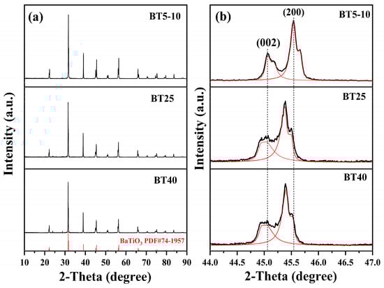 Figure 6, from top to bottom, shows the XRD and the locally enlarged XRD diagrams of the three samples. In Figure 6a, the XRD results of all three samples are consistent with the standard PDF card (JCPDS 74-1957), confirming that the synthesized crystals are BaTiO3. This result indicates that nano-sized raw materials with different particle sizes can effectively be used to produce BaTiO3 with a stable structure. Compared with BT40, no impurity peaks were observed in the XRD diagram of BT5-10, confirming that the introduction of ball milling technology and the use of nano-sized raw materials can effectively eliminate impurities such as BaTi4O9 and BaTi2O5. The results in Figure 6b further reveal that all three samples have split peaks near 2θ = 45° for the (002) and (200) crystal planes, which provides key evidence for the successful synthesis of the tetragonal phase of BaTiO3. In Figure 6b, the red curve represents the fitting of the split peaks at 45° for different samples. The symmetrical shape and non-split state of these peaks further confirm the existence of the tetragonal structure. It is noteworthy that the splitting between these two peaks is most pronounced in the BT5-10 sample, indicating that it has the best tetragonality.