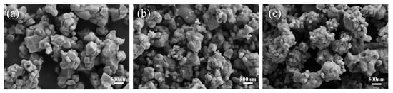 When the cumulative particle size distribution percentage reaches 10%, 50%, and 90%, the sample particle sizes are represented as D10, D50, and D90, respectively, indicating that particles smaller than these values account for 10%, 50%, and 90%. These three values provide a relatively intuitive view of the particle size distribution of the powder []. D10 and D90 represent the fine and coarse diameters of the powder, respectively, while D50 is the median particle size of the powder. The particle size distribution and average particle sizes (D50) of the BaTiO3 powders were determined using a particle size analyzer (Mastersizer 2000, Malvern Instruments Ltd., Worcestershire, UK).