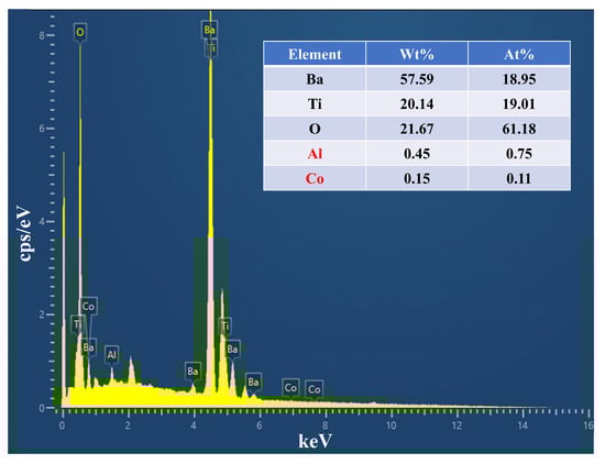 The energy-dispersive spectroscopy (EDS) data and quantitative elemental analysis for BT5-10 are presented in Figure 8. The sample exhibits an atomic composition of Ba (18.95%), Ti (19.01%), and O (61.18%), which approximates the 1:1:3 ratio characteristic of the stoichiometry of BaTiO3 [].