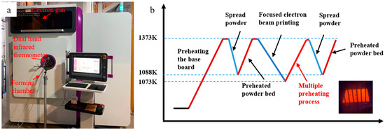 EB-PBF multiple preheating process (a) EB-PBF equipment based on the multiple preheating process. (b) Schematic diagram of the EB-PBF process utilizing the multiple preheating method (the slope of the broken line is illustrative only and does not represent the actual heating rate).