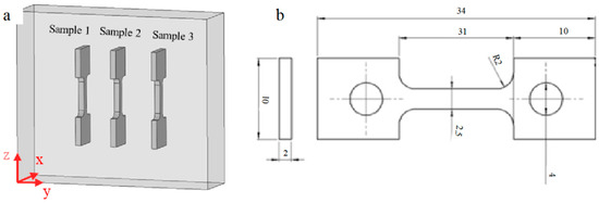 Schematic of the high-temperature endurance strength test specimens. (a) The locations in the as-built sample, and (b) the dimensions of the high-temperature enduring strength test specimens.