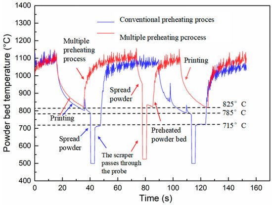 To address the issue of powder bed recyclability while also eliminating cracks caused by insufficient preheating, we developed a multiple preheating process for the powder bed based on existing equipment. The surface temperature of the multiple preheating process was compared with that of the conventional preheating process using a dual-band infrared thermometer at a substrate preheating temperature of 1000 °C, as shown in Figure 6. In the conventional preheating process, scattered preheating is stopped and switched to focused forming mode at each layer of the forming scan, which reduces the heated surface area. This results in a significant drop in surface temperature, from 1100 °C to approximately 800 °C. At the end of each layer-forming scan, the powder bed temperature further decreases from 800 °C to around 715 °C due to the lower temperature of the newly spread powder. The powder bed undergoes an initial temperature drop during the forming process, followed by a second drop during powder spreading. These two significant temperature fluctuations can create large temperature gradients and thermal stress, increasing the sensitivity to cracking. It is important to note that the temperature measurement device, an infrared thermometer, measures the surface temperature of the powder brush during the powder spreading process. During powder spreading, the powder bed temperature value momentarily drops to 500 °C below the measurement line, but it returns to normal after the powder brush has passed. The red curve represents the surface temperature change in the multiple preheating process. As shown, the post-preheat process raises the powder bed temperature of the printing surface back to 1100 °C, and after the powder brush spreads the powder, the powder bed temperature only drops to around 825 °C.