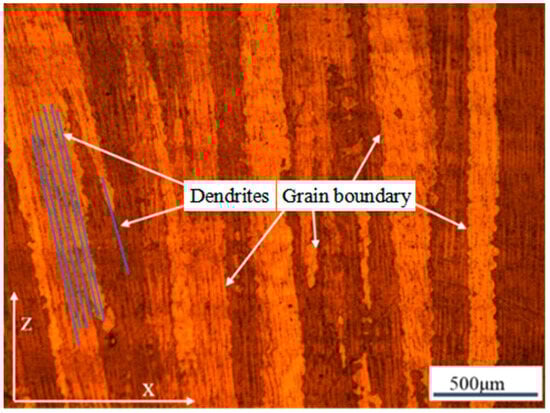By using the multiple preheating process, crack-free forming can be achieved at a powder bed preheating temperature of 1000 °C. This process not only enables the crack-free forming of difficult-to-weld high-temperature alloys but also ensures that the powder can be recycled at a lower powder bed temperature. Figure 7 shows optical microscope images of the internal structure of the crack-free specimen. The microstructure is primarily composed of columnar crystals, which gradually transition into dendritic crystals as the build height increases, with no cracks observed throughout the structure.