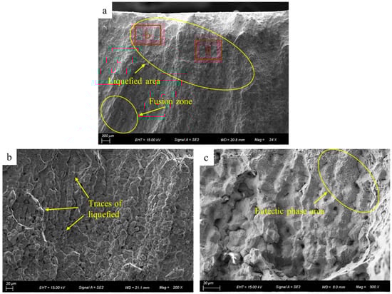 Direct observation of the side by SEM (a) liquefaction area, (b) liquefaction trace in (a), and (c) eutectic phase area.