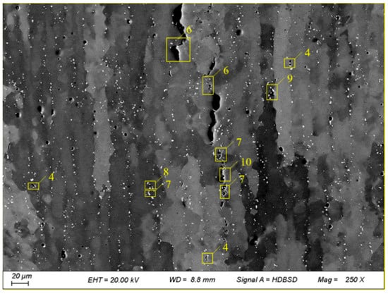 The compositional alignment near the crack was observed using SEM in backscatter mode, as shown in Figure 9. The yellow box highlights some of the carbides, with the number of carbide particles marked. From the figure, it is evident that there is a clear tendency for carbides to precipitate at the crack and dendrite boundaries. Additionally, there is a significant increase in the number of carbide particles within the yellow boxes, which aligns with the observation by Xu et al. that low-melting-point eutectics tend to precipitate at grain boundaries (GBs), leading to cracking [27].