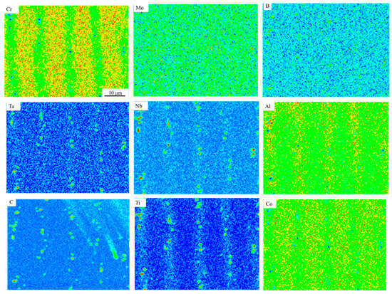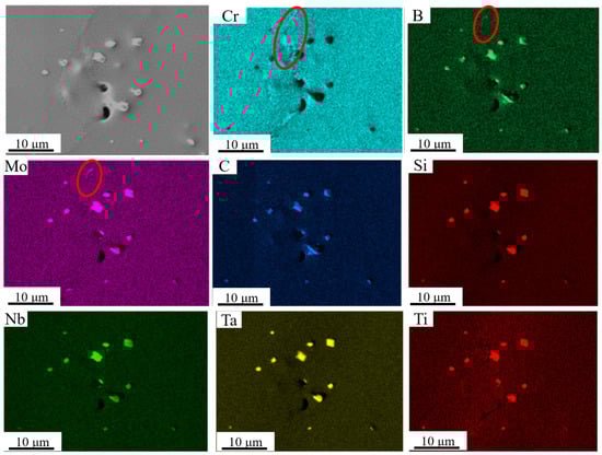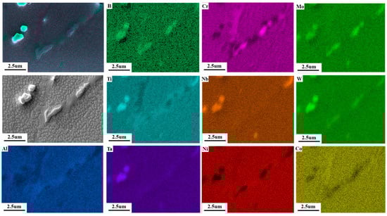 To further investigate the effect of elemental distribution on liquefaction cracks, an EDS mapping analysis was conducted on the area near the crack in Figure 9, as shown in Figure 10. The results indicate that carbides containing Mo, B, Ti, Ta, Nb, and Si are enriched near the crack. Additionally, closer observation reveals precipitates of Mo, B, and Cr near the grain boundaries of the crack. Edouard et al. similarly found boride precipitate phases, such as MB, M2B, and Cr5B3, enriched with Mo and Cr near liquefaction cracks during EB-PBF preparation of refractory nickel-based high-temperature alloys [28]. Montazeri et al. also observed similar low-melting-point borides enriched with Mo and Cr near liquefaction cracks during laser welding of the IN738 high-temperature alloy [33]. Furthermore, Zhong et al. [34] found numerous carbides containing Ti, Nb, and Ta precipitated near cracks in the IN738 direct energy deposition process. This provides further evidence that the low-melting-point eutectic precipitation phase is the root cause of liquefaction cracks.