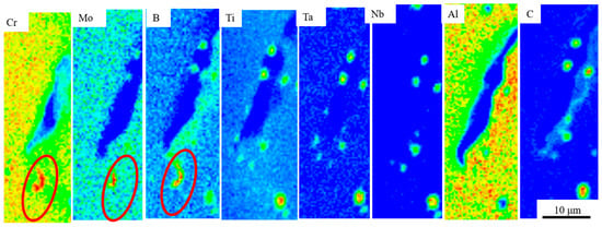 It is worth noting that, in comparison with Figure 9, Mo and Si showed overlapping data with C and Si in the EDS test spectra. However, since Si and C content are closely related to solidification cracking [37], it may not be fully accurate to judge the presence of carbides based solely on EDS results. As indicated by the red-circled region in Figure 11, low-melting-point eutectic borides enriched in Mo and Cr precipitate at grain boundaries near the cracks.