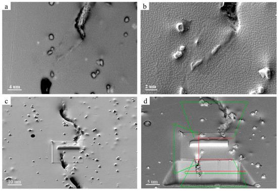 To accurately calibrate the B-rich phase, we continued sampling using focused ion beam technology. The B-enriched region was first identified under SEM observation, as shown in Figure 12. The selected area was then coated with a layer of metallic platinum for protection and subsequently cut using the focused ion beam. The entire cutting process is illustrated in Figure 13a–d.