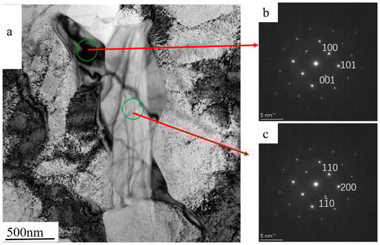 SAED calibration of the lower phase is shown in Figure 15c. The measured atomic spacings for the (110), (1–10), and (200) crystal planes are 0.37972 nm, 0.37972 nm, and 0.2685 nm, respectively, which, when compared with PDF card 65-2787, confirms that the phase is B3Cr5. In this phase, Mo and Mn atoms are partially replaced by Cr atoms, forming a substitutional solid solution in the precipitated phase.