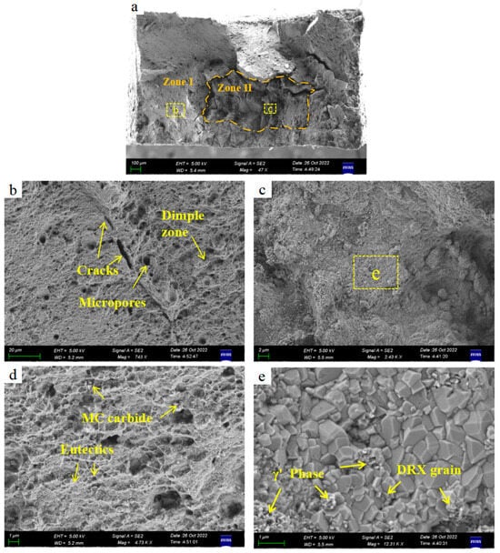 As the test time increased, the load-bearing area of the sample decreased, leading to a rapid rise in stress. Region II exhibited a completely different fracture morphology, transitioning from the flat fracture surface of Region I to an irregular, raised appearance, with noticeable macroscopic cracks (Figure 16a). The microstructure in Region II changed due to creep behavior; no micropores or networked γ/γ′ eutectic phases were observed, while a significant amount of typical blocky nano γ′ phases precipitated (Figure 16e).