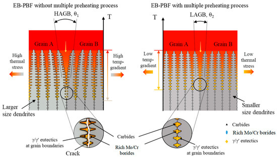 In summary, the liquation of γ + γ′ eutectics precipitated at grain boundaries (GBs) at lower temperatures is the fundamental cause, while the high-frequency thermal cycling ultimately triggers liquation cracking. These factors are closely related to temperature fluctuations during the additive manufacturing process. Therefore, controlling temperature variation presents a new approach to suppress liquefaction cracking. For example, Hagedorn et al. successfully prepared crack-free nickel-based high-temperature alloy M247 by heating the entire forming chamber to 1200 °C using induction heating during EB-PBF [29]. Similarly, Xu et al. [30] successfully limited the propagation of liquefaction cracks by heating the substrate to 1050 °C with medium-frequency induction and by controlling the columnar-to-equiaxed transition (CET), which restricted the growth of the rod-like γ′ phase.