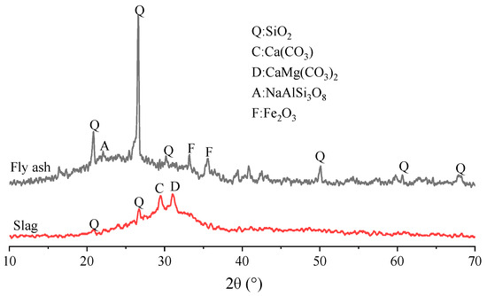 Figure 1 shows the XRD test results of raw materials fly ash and slag. Fly ash mainly contained amorphous substances and components such as quartz (SiO2), sodium feldspar (NaAlSi3O8), hematite (Fe2O3), etc. The slag mainly contained quartz (SiO2), calcite (CaCO3), dolomite (CaMg (CO3)2), and other components.