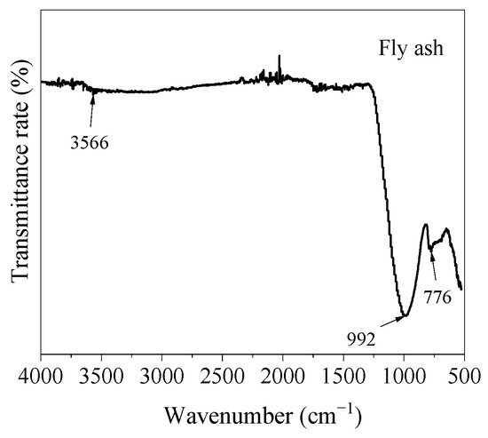 Figure 2 shows the FT-IR spectrum of the raw material fly ash. The absorption peak of fly ash at 776 cm−1 was the Si-O-Si bending vibration band, and there was a clear absorption peak at 992 cm−1, which belonged to Si-O stretching vibration. The absorption peak at 3566 cm−1 was the stretching vibration of non-hydrogen-bonded or weakly hydrogen-bonded hydroxyl groups in Ca-OH bonds.