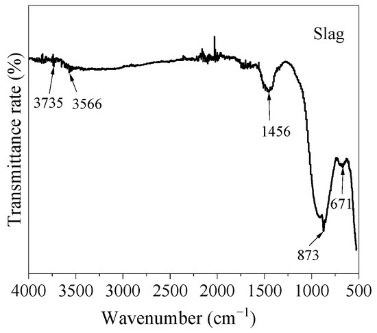 Figure 3 shows the FT-IR spectrum of the raw material slag. The absorption peak at 671 cm−1 was attributed to the Si-O-Si bending band, while the absorption peaks at 873 cm−1 and 1456 cm−1 corresponded to the asymmetric stretching vibration of O-C-O in carbonates. Similar to fly ash, the absorption peak at 3566 cm−1 was the stretching vibration of non-hydrogen-bonded or weakly hydrogen-bonded hydroxyl groups in Ca-OH bonds. The weak absorption peak at 3735 cm−1 was caused by the stretching of SiO-H in the SiOH group.