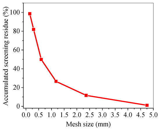 In the raw materials of mortar, natural river sand with a fineness modulus of 2.66 was selected as the fine aggregate, and the grading curve of sand is shown in Figure 4. The fibers used were short cut GF and PPF with a length of 12 mm. The appearance and main parameters of the fibers refer to the author’s previous research [56].