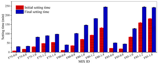 When the fly ash content was 75%, the setting time of the pastes was significantly lower than that of the pastes when the fly ash content was 80% and 85%. The initial setting time of the pastes in groups F75-0.6, F75-0.8, and F75-1.0 was less than 45 min. When the activator modulus was higher than 1.0, the initial setting time of the pastes was slightly higher than 45 min. However, the initial and final setting times of the F75-1.4 pastes were only 54 min and 98 min, respectively.