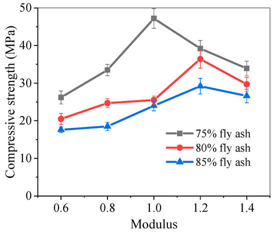 The effect of activator modulus on the compressive strength was that the development of compressive strength was affected by two factors: sodium hydroxide and sodium silicate in alkali activator. The Na+ in the activator could not only form sodium aluminosilicate gel, but its content could also affect the rate of gel formation. In addition, increasing the concentration of OH− appropriately would significantly increase the solubility of fly ash. As the modulus of alkali activator increased, the decrease in compressive strength in the later stage was due to the excessive content of Na+ [73,74,75].
