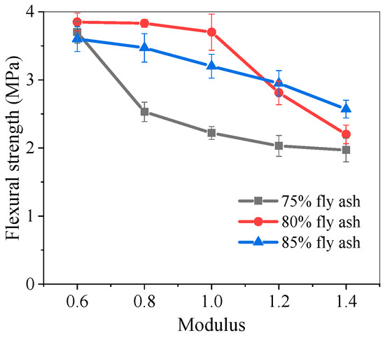 Figure 7 shows the flexural strength of alkali-activated fly ash slag pastes at 28 days. At a certain proportion of fly ash, as the activator modulus increased, the flexural strength of pastes decreased, which was significantly different from the trend of compressive strength. This may be due to the Na+ content in the alkaline activator exceeding the appropriate dosage. When the fly ash content was 80%, as the activator modulus increased from 0.6 to 1.0, the flexural strength of pastes slightly decreased from 3.85 MPa to 3.70 MPa. But when the activator modulus increased to 1.4, the flexural strength rapidly decreased, and the strength value of F80-1.4 was only 57.1% of F80-0.6.