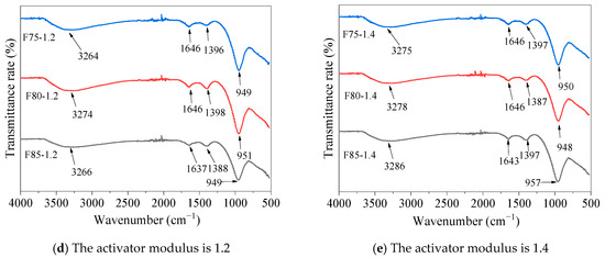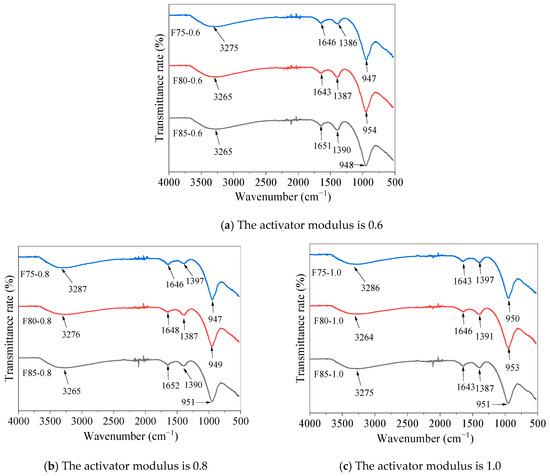 Due to the high content of silica in fly ash, in the alkali-activated fly ash system, the reaction began with the OH− ions in the alkali activator breaking the Si-O-Si bonds [72]. As the modulus of the activator increased, the concentration of OH− ions in the activator solution decreased, resulting in a weaker ability to break Si-O-Si bonds and a slower reaction process, thus prolonging the setting time.