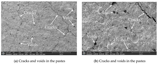 Figure 9 and Figure 10 show SEM images of the F80-0.6 and F80-1.2 groups of pastes, respectively. In Figure 9a,b, a large number of pores and cracks could be observed in the F80-0.6 pastes when magnified 100 times and 500 times, respectively. In addition to using SEM, non-destructive testing of cracks can also be attempted using high-frequency electromagnetic techniques [81,82,83]. In Figure 10a,b, at magnifications of 100 and 500 times, cracks could also be observed in the F80-1.2 pastes, but the number of pores was much lower than that of F80-0.6. This is mainly due to the slight instantaneous setting of the newly mixed F80-0.6 composite system, which makes it difficult to compact after molding, resulting in more pores. At the same time, this is also the direct reason why the compressive strength of the F80-0.6 group of pastes is only 56.3% of the strength of the F80-1.2 group. Due to the high dosage of fly ash and curing at room temperature, fly ash particles at different reaction stages could be seen in the SEM images.