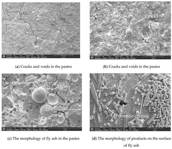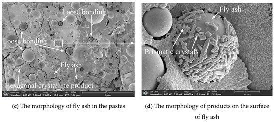 Figure 9d is an enlarged partial view of Figure 9c, showing the formation of numerous columnar crystals on the surface of fly ash particles. These columnar crystals are the same as the products generated on the surface of fly ash particles in reference [84]. Figure 10d is an enlarged partial view of the fly ash particles in Figure 10c, and it could also be seen that the surface of the fly ash particles was covered with a large number of columnar crystals. These crystals filled the gap between the fly ash particles and the surrounding matrix, making the gel structure more compact.