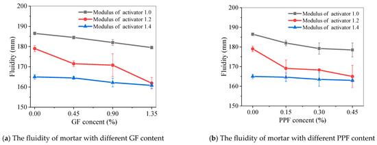 Figure 11 shows the fluidity of alkali-activated fly ash slag mortar with different GF and PPF dosages. The fluidity of the mortar decreased with the increasing fiber content, and when the fiber content was determined, the fluidity of the mortar decreased with an increase in the modulus of the alkali activator.
