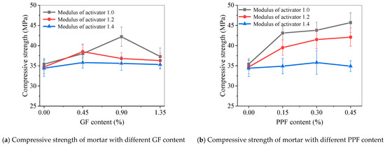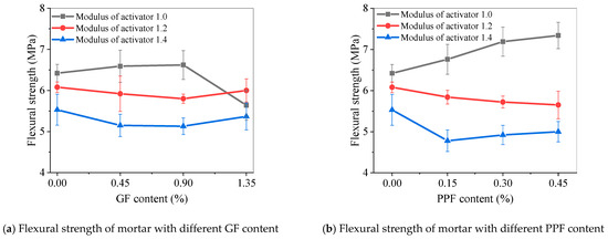 Figure 12 shows the 28-day flexural strength of alkali-activated fly ash slag mortar reinforced with GF and PPF. For GF-reinforced alkali-activated fly ash slag mortar, when the activator modulus was 1.0, the flexural strength increased first and then slightly decreased with the increasing GF content. The optimal GF content was 0.90%. At this time, the flexural strength of the M1.0-GF0.90 mortar was 6.62 MPa, which was 3.12% higher than the control M1.0-0 mortar. When the modulus of the activator increased to 1.2 and 1.4, the addition of GF slightly reduced the flexural strength.