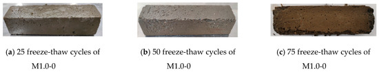 A KDR-V5 concrete rapid freeze-thaw test box was used for freeze-thaw cycle testing of the mortar. According to the standard GB/T 41060-2021 [61], the maximum temperature at the center of the specimen is (5 ± 2) °C, and the minimum freezing temperature is (−18 ± 2) °C. A freeze-thaw cycle is completed every 4 h. The specimens were weighed after every 25 freeze-thaw cycles, the mass loss was calculated, and the peeling of the mortar surface was observed and recorded.