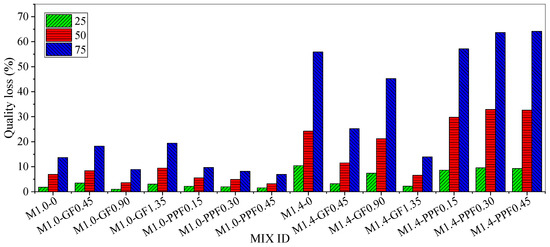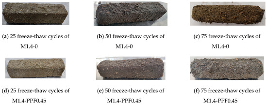 (4) The frost resistance of the mortar with an activator modulus of 1.0 was significantly better than that of the mortar with an activator modulus of 1.4. Adding fibers could reduce the quality loss and surface morphology deterioration of the mortar after freeze-thaw cycles. Among them, the quality loss of M1.0-PPF0.45 mortar decreased by 49.30% compared to M1.0-0, effectively delaying the deterioration of freeze-thaw performance.