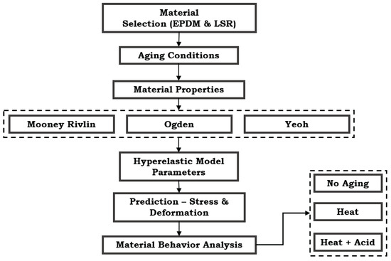 This section details the methodological framework to investigate the mechanical performance and predictive maintenance of EPDM and LSR gasket materials in PEMFC systems. As depicted in Figure 1, the proposed methodology involves a multi-step framework integrating hyperelastic modeling, simulation, and EL to comprehensively assess material degradation under varied aging conditions. The framework employs Mooney–Rivlin, Yeoh, and Ogden models to capture the stress–strain characteristics of EPDM and LSR, followed by a machine learning approach to predict material behavior. This combined approach facilitates predictive maintenance by enabling the accurate classification of aging effects on gasket materials and supports optimized model selection for performance prediction in PEMFC applications.