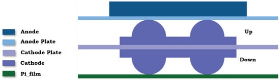 The gasket assembly consists of multiple layers that provide structural integrity and effective sealing under operational conditions. As shown in Figure 3, the assembly includes a Pi film layer at the base, followed by a structured cathode section with separate cathode-up and cathode-down layers, a central cathode plate, and finally, an anode plate supporting the anode layer. This configuration ensures optimal mechanical performance and compatibility with the aging conditions under study.