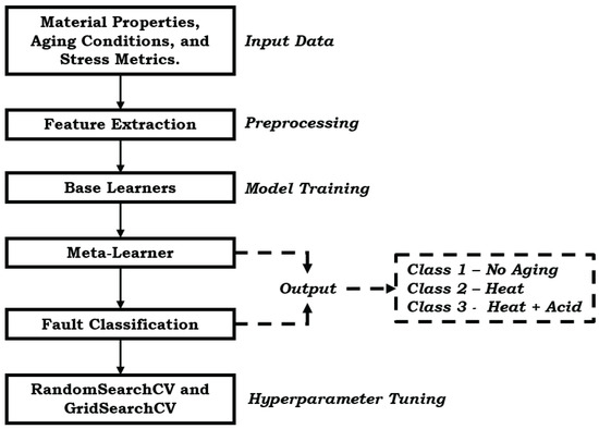 This study utilizes a stacked EL model, combining Random Forest (RF) and Support Vector Machine (SVM) classifiers to improve classification accuracy for aging effects in EPDM and LSR gasket materials. The architecture, illustrated in Figure 4, integrates RF and SVM base learners with a meta-classifier, aiming to capture complex patterns in the data and improve robustness against data variability. EL combines multiple models, or base learners, to achieve greater predictive accuracy and robustness than individual models. By leveraging the complementary strengths of different algorithms, EL reduces the risk of overfitting, making it well suited for classifying material behavior under aging conditions in EPDM and LSR gaskets. This supports predictive maintenance by accurately modeling stress distribution and aging effects, contributing to the enhanced durability of PEMFC gasket materials. Specifically, this stacking ensemble model uses SVM and RF to improve accuracy in classifying stress distributions and aging effects. It enables proactive maintenance interventions by accurately predicting material degradation and reducing false positives and negatives in fault detection. The stacking framework integrates predictions from SVM and RF through an additional RF classifier as the meta-learner. This setup maximizes classification accuracy for non-linear, high-dimensional data: