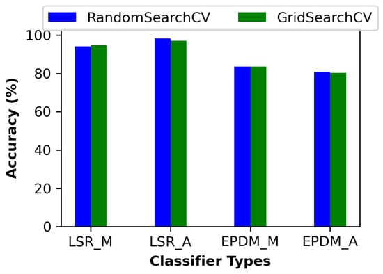 where TP = true positives, TN = true negatives, FP = false positives, and FN = false negatives. To evaluate the effectiveness of the stacked EL model, classification performance was measured using standard metrics, with particular emphasis on achieving high accuracy and balanced precision and recall. A model F1-score above 0.80 was set as the benchmark for reliable performance, ensuring the accurate classification of degradation patterns while minimizing false positives and false negatives. This classification standard supports the EL model’s role in predictive maintenance, providing reliable assessments of PEMFC gasket conditions under aging effects in EPDM and LSR materials [52].