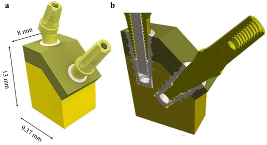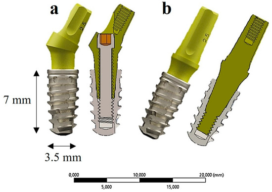 A three-dimensional (3D) model of the implants with abutments. (a) The implant with a 30° inclined abutment (IA); (b) the 30° inclined implant with a straight abutment (II).