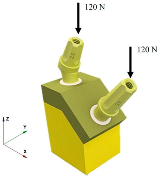 Molars are designed to withstand substantial vertical loads resulting from food compression and the activity of masticatory muscles during the process of chewing. Their morphology, characterized by prominent cusps and extensive masticatory surfaces, is optimized to accommodate these forces. Nonetheless, it is important to recognize that inclined forces, in addition to vertical ones, may also act on the molars, arising from lateral jaw movements or eccentric forces during the mastication of harder foods. Despite this, for the purposes of this study, the relatively low intensity of oblique loads, in comparison to vertical loads, was regarded as negligible [62]. A compressive force of 120 N was applied to the upper surface of the abutment along its long z-axis direction, simulating the forces generated during mastication on molars [42] (Figure 6).
