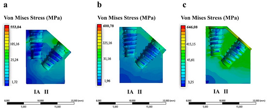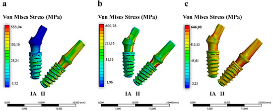 Von Mises stress distribution on IA and II as a function of cortical thickness: (a) 3 mm; (b) 1.5 mm; (c) 0.5 mm.
