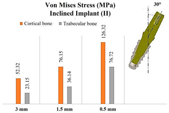 The placement of the implant at an angle of 30° in the bone resulted in an increase in von Mises stress compared to the IA configuration (Figure 9).