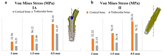 Von Mises stress values associated with cortical and trabecular bones in relation to cortical thickness. (a) IA; (b) II.