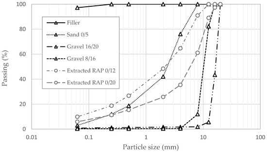 Particle size distributions of aggregate and RAP fractions.
