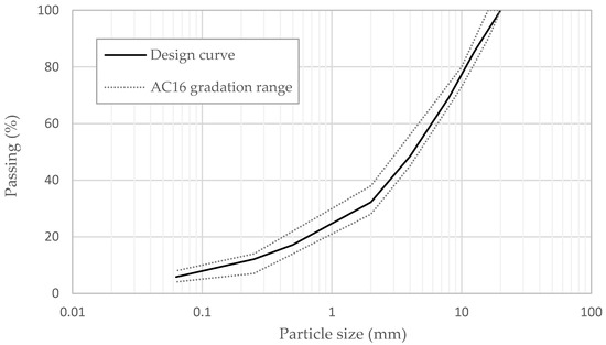 The type of asphalt mixture selected for the experimental study was characterized by a maximum nominal aggregate size of 16 mm (AC16), with a particle size distribution determined according to Italian technical specifications for standard dense-graded binder courses [39]. The target gradation curve and the gradation limits adopted are displayed in Figure 2. The total amount of RAP was added at a rate of 30 and 20% by weight of the aggregate for RAP 0/12 and RAP 0/20, respectively.