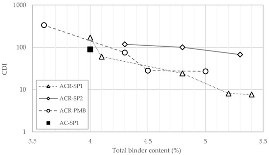 Conversely, the differences appeared to be more relevant when the CDI parameter was considered, indicating that this index was more effective in evaluating the workability properties of the mixtures. In particular, a clear distinction can be made between the CDI curve corresponding to the ACR-SP2 group with respect to those of the ACR-SP1 and ACR-PMB groups. The higher compaction effort required for the ACR-SP2 mixtures was evidently related to the higher viscosity of the binder phase due to the higher dosage of plastics. Moreover, the CDI values were less sensitive to the binder content for these mixtures compared with the others. As a result, in the range considered in this study, the gap between ACR-SP2 and the other mixtures increased at increased percentages of the total binder.