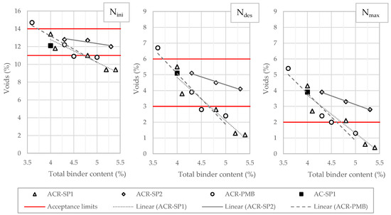 The v values were obtained at different numbers of gyratory rotations, set equal to 10 (Nini), 120 (Ndes), and 200 (Nmax). Nini is the number of gyrations intended to reproduce the initial density of the mix, Ndes is the number of gyrations required to produce a density equivalent to the expected in-place density after compaction, and Nmax is the number of gyrations considered to ensure that the mixture does not densify too much under traffic to avoid potential rutting phenomena. The graphs in Figure 5 illustrate the variation in voids as a function of the binder contents of the different mixtures. The graphs also show the specification limits defined by Italian technical standards, which were taken as a reference. The v values decreased with an increasing total binder content, with the curves corresponding to the ACR-PMB and ACR-SP1 blends showing quite similar trends at all gyration levels. This indicates that the combination of neat Binder A and 0.3% waste plastics produced equivalent effects in terms of the sensitivity of the volumetric properties to variation in the binder content compared with the standard modified Binder B. It is worth noting that data points corresponding to the AC-SP1 mixture containing 0.3% waste plastics with no RAPs perfectly fit both curves, indicating that the presence of reclaimed asphalt had no influence on the degree of compaction. The use of 0.5% plastics (ACR-SP2) resulted in a significantly different response. The reduced slope of the curves indicates a reduced dependence on the binder dosage. In addition, the curves appear to be vertically shifted upward compared with the others (ACR-PMB and ACR-SP1). This implies that more virgin bitumen is required to achieve predefined degrees of compaction and to compensate for the stiffening effect consequent from the higher dosage of plastics added to the blends.