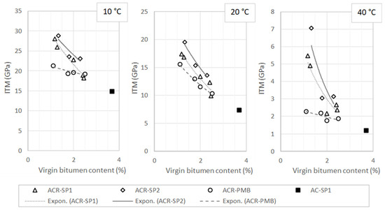 It was observed that the stiffness moduli decreased with increasing binder dosages for all materials at all temperatures. It was also observed that the ACR-SP2 mixtures exhibited the highest stiffness, followed by ACR-SP1 and ACR-PMB. The differences were more pronounced at a temperature of 40 °C, especially when comparing the ACR-SP1 and ACR-PMB groups. This result can be attributed to the higher amount of polymer present in the hybrid blends compared with the wet blends. The diagrams also report the ITM parameters obtained for the AC-SP1 mixture, indicating lower values with respect to other ones due to the absence of an RAP. However, it is interesting to note that curves of both the ACR-SP1 and ACR-PMB mixtures tend to reach the points corresponding to AC-SP1 as the content of virgin bitumen increased. The increase in virgin binder is associated with a progressive replacement of the RAP with virgin aggregate, which ultimately led to the mixtures having the same characteristics.