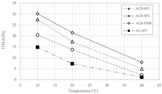 Pairwise comparison of the mixtures allowed discriminating the effects of different factors considered in the investigation. The lower ITM values of ACR-PMB compared with those of ACR-SP1 and ACR-SP2 indicate a less pronounced stiffening effect of SBS polymer modification with respect to modification with plastics, which is ascribable to the softer bituminous phase of PmB. The difference between ACR-SP2 and ACR-SP1 indicates that the increase from a 0.3% to 0.5% plastic dosage resulted in a relative increase in stiffness of about 22–23%. The difference between ACR-SP1 and AC-SP1, which had the same composition except for the use of solely virgin aggregate in the second one, can evidently be attributed to the RAP.