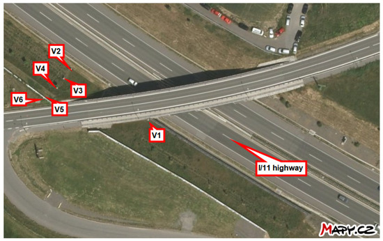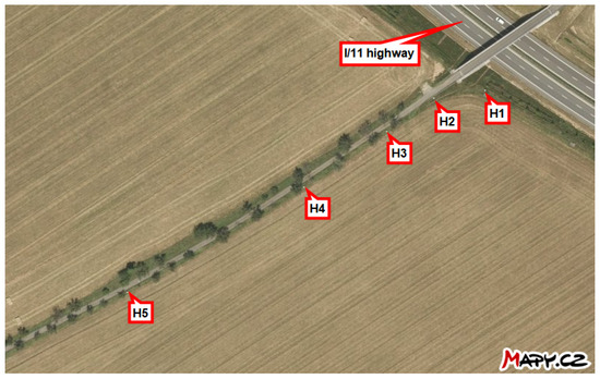 This study investigates the ability to measure the average monthly deposition of chloride ions using stands developed for the wet candle method, in accordance with the ISO 9225 standard [4]. These stands are situated in the vicinity of the I/11 highway between Ostrava and Opava in the Czech Republic, at distances ranging from 3 m to 180 m (see Figure 1). Each stand is marked in Figure 2 for the locality Hrabyně, in Figure 3 for the locality Vřesinská, and in Figure 4 for the locality 17. listopadu. This highlights the fact that the data were collected at different locations and at different distances from the pollution source. This is the authors’ attempt to exclude local effects of individual sites. They are located at 3 independent sites, with a total of 14 stands.