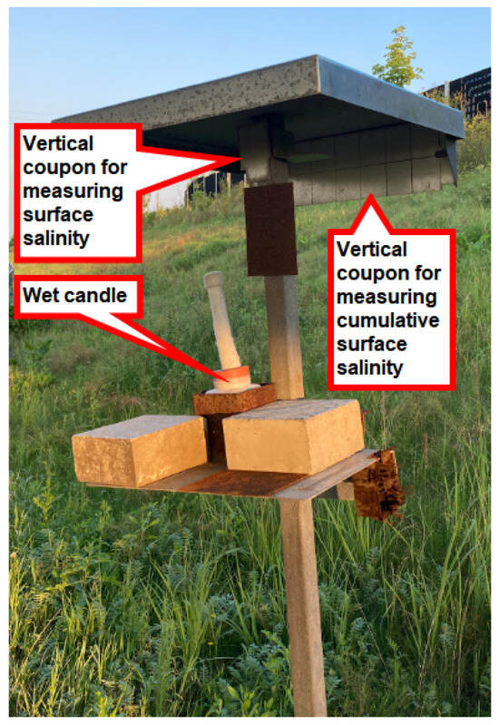 In the authors’ opinion, it is appropriate to validate the results of the application of the Bresle method to the measurement of deposition rate using the wet candle method, which is introduced in ISO 9225 [4]. In addition, other chemical and mechanical analyses (e.g., corrosion product thickness, scotch tape test, or XRD or XRF analysis, which are mentioned, for example, in [27,43], should be performed on the surfaces, which do not seem appropriate for validating the results of the Bresle method, although they provide important additional information.